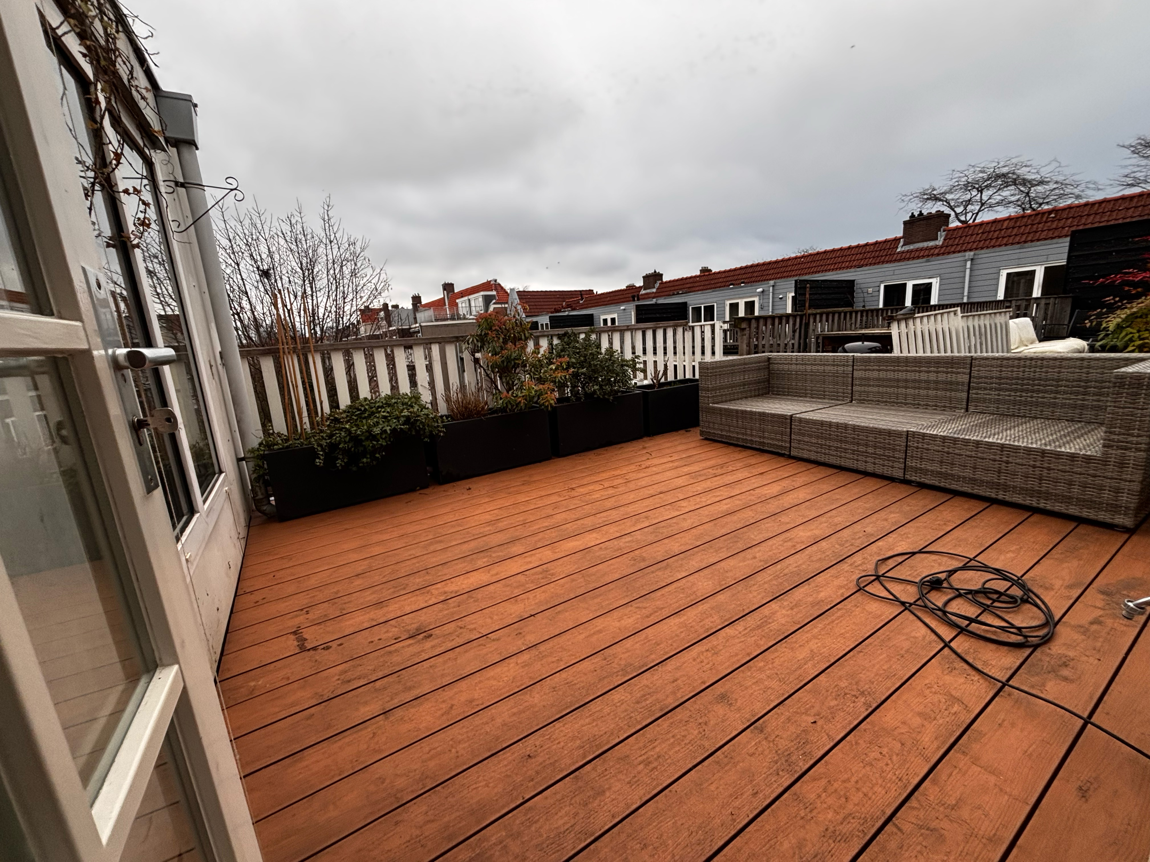 Voor dit project in Amsterdam West verzorgden wij de volledige aanleg van een dakterras inclusief schutting. Beide zijn uitgevoerd in Naturinform composiet in de kleur Royal Elm. Composiet is een uitstekende keuze voor daktrassen: weerbestendig, onderhoudsarm en duurzaam. De warme houtlook van Royal Elm geeft het terras een natuurlijke en luxueuze uitstraling.
